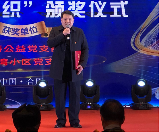 活动继续,由蜀山区人大代表王明明、王思亮为优秀党组织颁发荣誉证书,君善公益党支部书记梅绍辉、天琴湾党支部书记沙广明上台接受证书并发表讲话。梅绍辉书记:“大家好!我是君善公益梅绍辉,君善001号员工。感谢上级党组织的培养,感谢政府各部门领导的关心和帮助,感谢大家对君善公益的信任和厚爱。一路走来,为爱出发。今天的君善公益和大家一起走过5年的基础打造,面临10年的标准化建设,展望未来20年的发展战略。我们共同规划“5.10.20”战略,开启君善公益新征程!不忘初心,砥砺奋进。我会“用有限的生命投入到无限的服务中去,再用无限的服务拓宽有限的生命。”在此新年到来之际,我代表君善公益全体同仁,致敬2019!致敬公益慈善事业的朋友!致敬上级党委!致敬政府各部门领导!致敬父老乡亲!致敬伟大的祖国!我们将一如既往,努力拼搏!全力以赴的做好公益慈善服务!向国家献礼!向人民群众献礼!预祝大家身体健康!工作顺利!新年愉快!阖家幸福!谢谢大家!”
