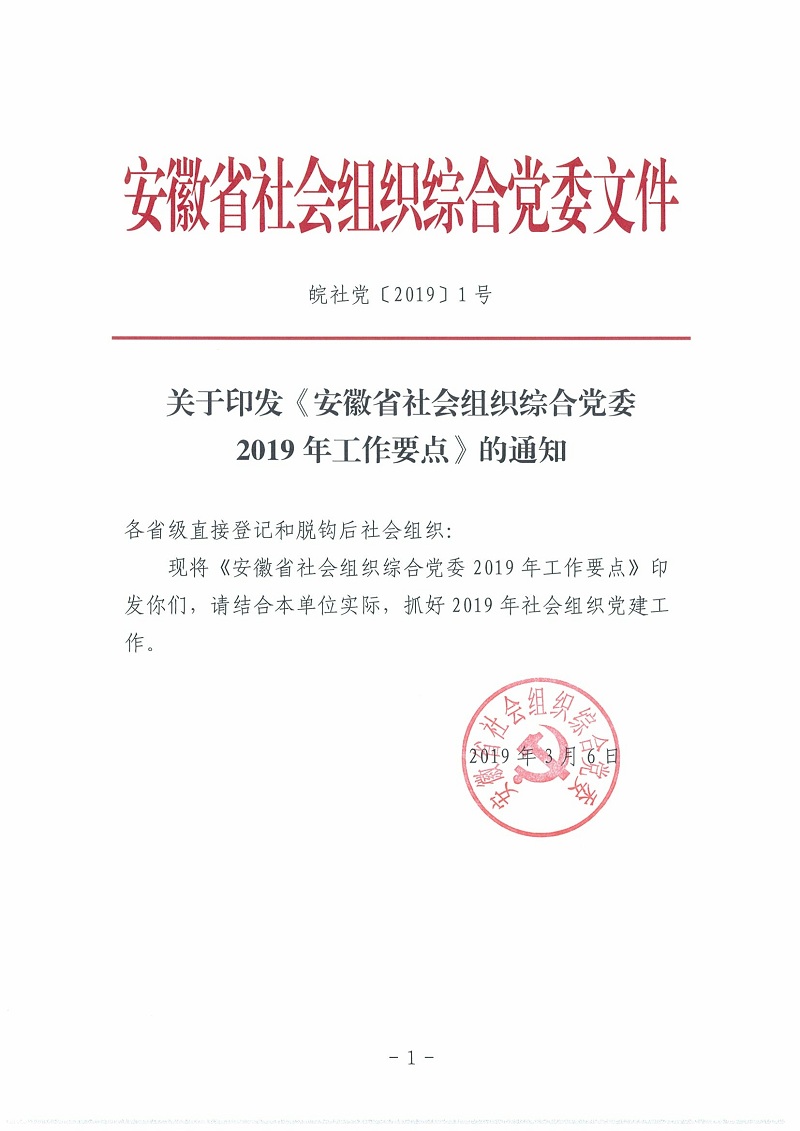 关于印发《安徽省社会组织综合党委2019年工作要点》的通知