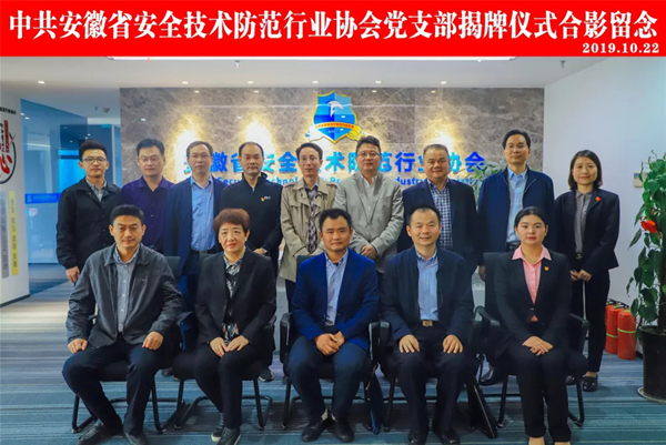 10月22日上午,中共安徽省安全技术防范行业协会党支部揭牌仪式隆重举行。安徽省社会组织综合党委委员冯斌,安徽省公安厅科技信息化处信息中心主任罗毅、秘书科李大成,安徽省安全技术防范行业协会理事长王慧莉、常务副理事长万森、卢青松、王佐成、监事长田维源,安徽省安全技术防范行业协会党支部书记、秘书长于利莉,安徽力瀚科技有限公司党支部书记徐永成,合肥佳讯科技有限公司支部委员会副书记蒋学武,中徽建技术有限公司第二党支部委员张治等人出席,揭牌仪式由协会常务副理事长万森主持。