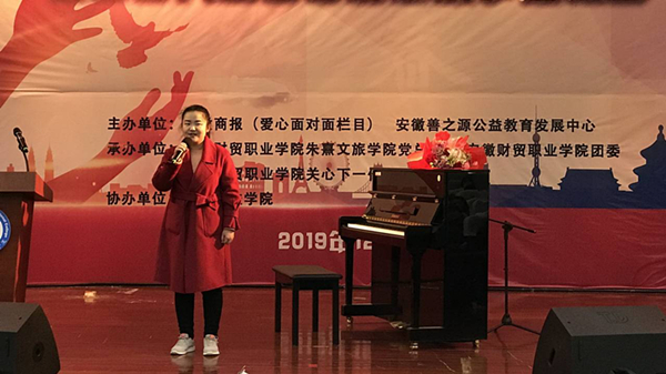为扎实开展“不忘初心 牢记使命”主题教育,充分发挥“身边榜样”的示范带动、典型引领作用,12月25日下午,安徽善之源公益教育中心党支部联合安徽财贸职业学院朱熹文旅学院党总支举办“不忘初心 牢记使命”主题教育“身边榜样”先进事迹报告会,蜀山好人王香君励志故事进校园——有爱有改变,引导激励党员干部向先进典型看齐、向身边榜样学习,悟初心、守初心、践初心,担负时代使命,创造一流业绩。中国大学生自强之星、安徽省第一个音乐高考盲人考生、天津音乐学院优秀毕业生,蜀山好人王香君应邀来到了活动现场。安徽善之源公益教育中心党员,安徽财贸职业学院朱熹文旅学院党总支书记宋凌云和师生代表150余人出席了此次活动。安徽商报“爱心面对面”公益新闻栏目负责人,合肥好人邱红作为特约主持人参加活动。
