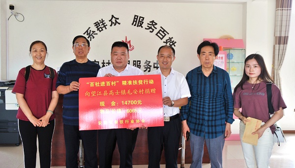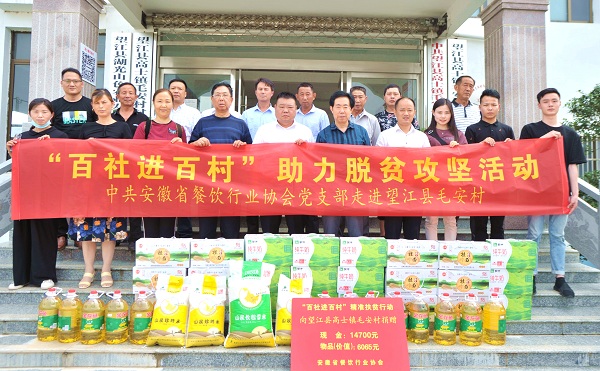 6月19日,省餐饮行业协会携蒙牛、金龙鱼、北大荒、先徽等会员企业代表,一行12人走进望江县高士镇毛安村,开展“百社进百村”扶贫活动。省餐协秘书处现场捐款14700元;会员企业捐赠米、面、油、奶等,价值6065元。扶贫组一行走村串户,调研扶贫对象,重点与吴四结、王胜兵两贫困户,开展了一对一扶贫。