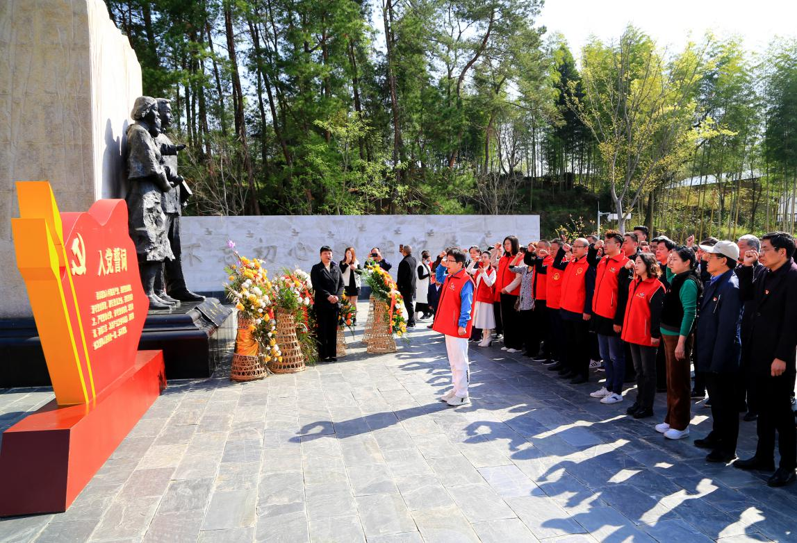 在岳西县初心与使命陈展馆前,社会组织全体党员高举右拳,面对鲜红的党旗,重温入党誓词。