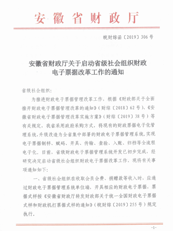安徽省财政厅关于启动省级社会组织财政电子票据改革工作的通知