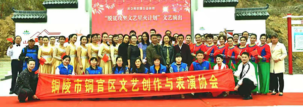 10月26日下午,铜陵市社会组织扶贫志愿服务五团奔赴枞阳县白柳镇山河村进行“脱贫攻坚--文艺星火计划”文艺演出,本次义演由铜官区文艺创作与表演协会承办,山河村100多名群众观看了演出。