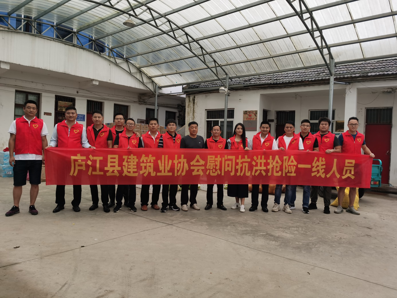 7月27日上午,庐江县建筑业协会组织18家会员代表与一名爱心人士,携价值约3万元捐赠物资(电风扇、生活急用品、蔬菜等)前往石头镇,慰问临时安置点受灾群众。