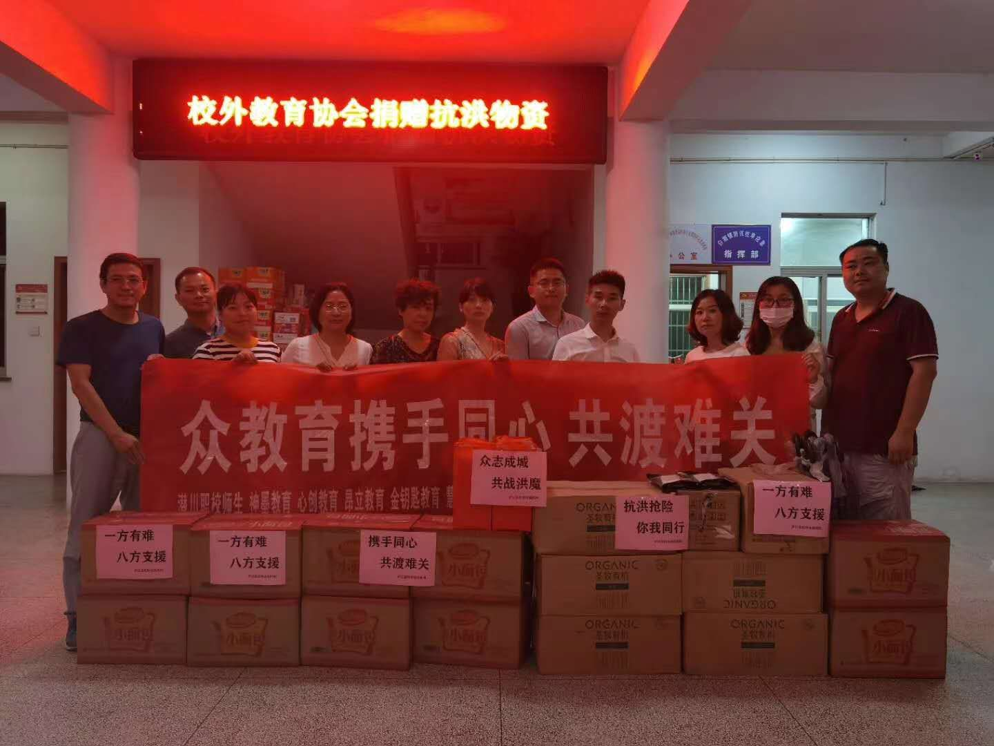 7月27日下午,县校外培训学校联合购买物资,捐赠20台烘干机至县民政局救灾物资中心,100条内裤送至城南驻军部队,100个收纳箱、100台电风扇、雨伞、充电宝、晾衣架等生活物资送至石头镇、白湖镇转移安置点,助力我县抗洪抢险救灾工作。
