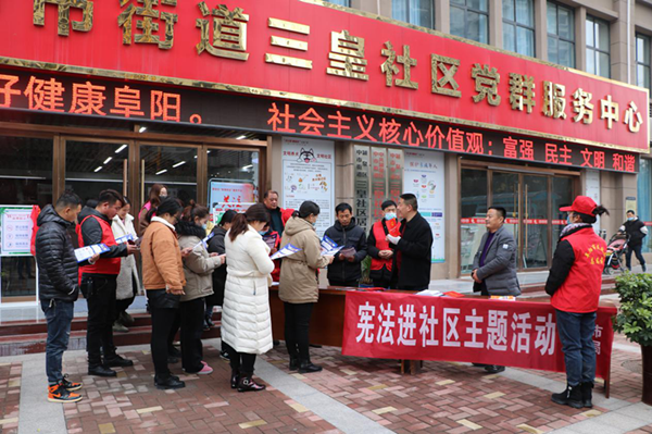 12月1日上午,阜阳市民政局组织阜阳市社区便民服务中心志愿者及法律专家深入颍泉区中市街道三皇社区开展“宪法进社区”主题宣传活动,旨在推动社区居民集中深入学习宣传贯彻宪法、弘扬宪法精神、维护宪法权威,形成在社区学习、宣传、贯彻宪法的浓厚氛围。此次活动通过设立“宪法宣传点”、悬挂宣传横幅、发放宣传资料、解答法律咨询等形式开展,发放宣传资料300多份,接受群众咨询20多人次。