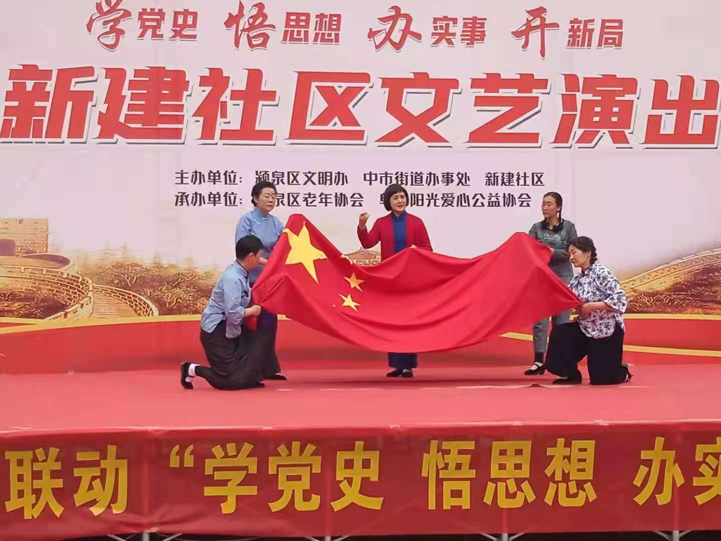 4月18日,由阜阳市颍泉区文明办、中市街道办事处、新建社区主办,阜阳阳光爱心公益协会、颍泉区老年协会承办的新建社区三社联动“学党史、悟思想、办实事、开新局”大型文艺演出活动,在阜阳市新建社区慧湖广场举行。