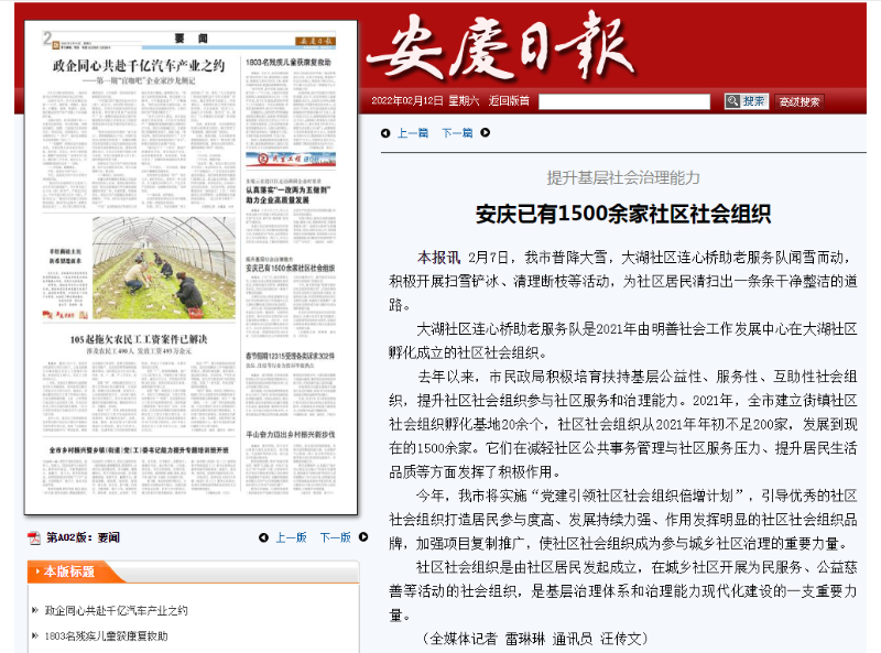 今年,安庆将实施“党建引领社区社会组织倍增计划”,引导优秀的社区社会组织打造居民参与度高、发展持续力强、作用发挥明显的社区社会组织品牌,加强项目复制推广,使社区社会组织成为参与城乡社区治理的重要力量。