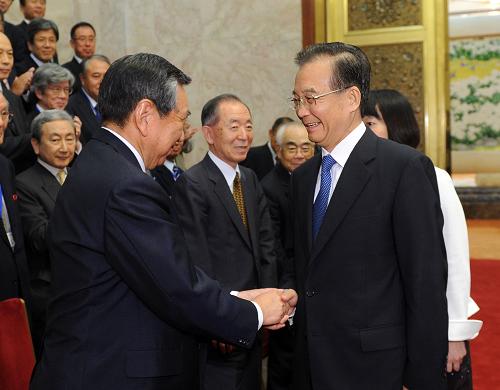 7月24日,国务院总理温家宝在北京人民大会堂会见由前众议院议长河野洋平率领的日本国际贸易促进协会2011年度访华团。新华社记者 李涛 摄