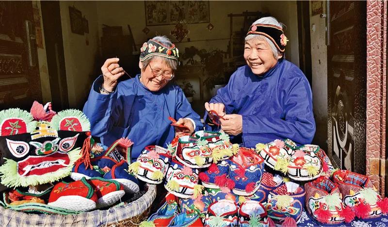 安徽省砀山县关帝庙镇小华楼村自古以来就有制作“虎头鞋”、“虎头帽”等儿童衣物的传统,自脱贫攻坚以来,该村积极引导、鼓励留守妇女通过手工针线活增加收入、贴补家用,村民收入状况明显改观。图为2020年12月19日,市级非遗砀山虎头鞋(虎头帽)传承人樊敏(左)和当地留守妇女在加工传统儿童鞋帽。人民图片 崔猛/摄