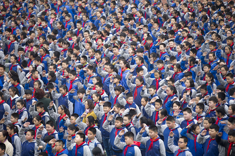 2018年3月5日,太原,学生参加开学典礼。受“全面二孩”政策的影响,义务教育阶段正陆续迎来适龄人口入学高峰。