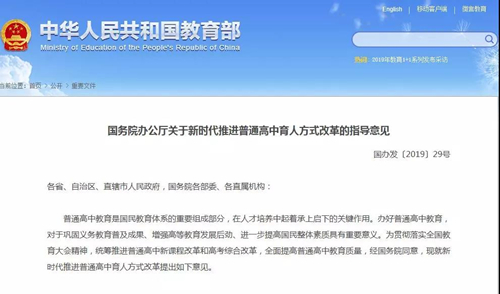 6月19日,国务院办公厅发布《关于新时代推进普通高中育人方式改革的指导意见》提出,进一步健全分类考试、综合评价、多元录取的高校招生机制。综合素质评价将作为高校招生录取的重要参考。