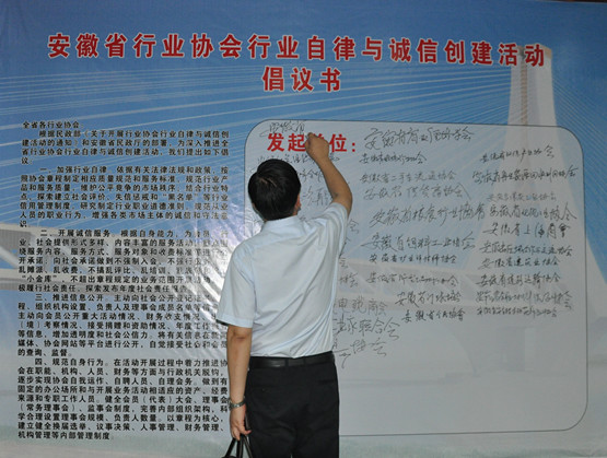 与会的行业协会代表在《行业协会行业自律与诚信创建活动倡议书》宣传栏上郑重签名