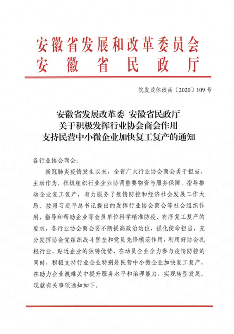 安徽省发展改革委 安徽省民政厅关于积极发挥行业协会商会作用支持民营中小微企业加快复工复产的通知