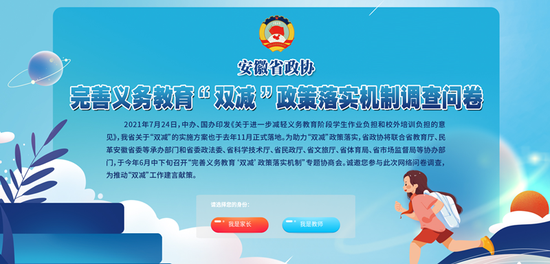 2021年7月24日,中办、国办印发《关于进一步减轻义务教育阶段学生作业负担和校外培训负担的意见》,我省关于“双减”的实施方案也于去年11月正式落地。为助力“双减”政策落实,省政协将联合省教育厅、民革安徽省委等承办部门和省委政法委、省科学技术厅、省民政厅、省文旅厅、省体育局、省市场监督局等协办部门,于今年6月中下旬召开“完善义务教育‘双减’政策落实机制”专题协商会。诚邀您参与此次网络问卷调查,为推动“双减”工作建言献策。