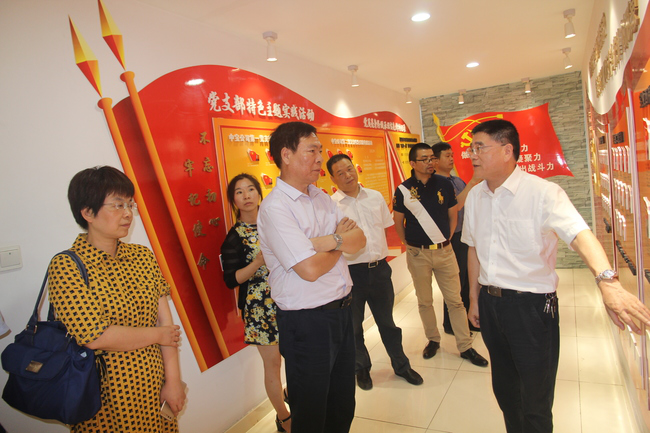 2018年8月15日下午,全国工商联宣教部副部长李兵书、宣教部干部刘捷,上海嘉成轨道交通安全保障系统股份公司董事长史和平,中国民营文化产业商会副秘书长王倬雅,全联民办教育出资者商会常务理事、北京泰昊赋能科技有限公司董事长黄智,全联汽摩配用品业商会常务理事、中汽万宇集团总裁陈维秀,北京衡源德路集团执行董事朱灿一行七人在合肥市政协副主席、市工商联主席姚亚妹,新站高新区工商联党组书记、经贸发展局副局长陈太胜等人陪同下,来到安徽省浙江商会会长单位安徽宝业建工集团调研企业党建工作。安徽省浙江商会会长、宝业集团执行董事、安徽宝业建工集团总经理高君,安徽宝业建工集团党委书记杨忠命陪同调研。