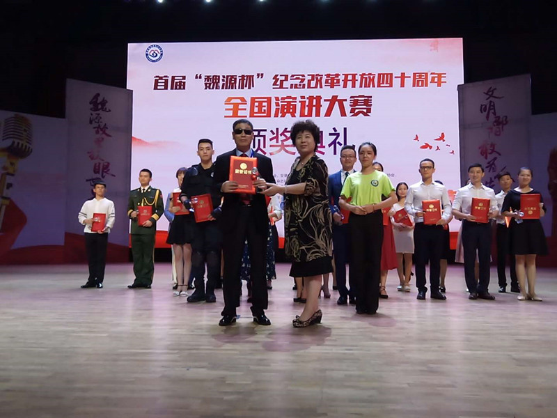 7月29日,安徽省演讲学会选派选手王良成(盲人)在湖南省邵阳市举办的首届中国魏源杯纪念改革开放四十周年全国演讲大赛上摘得桂冠,夺得特等奖