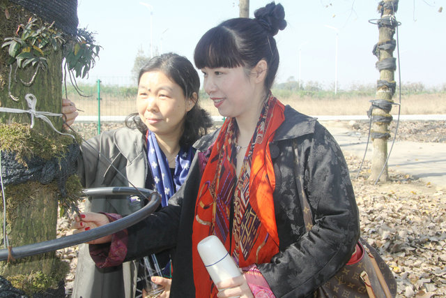 金洪洋董事长又带领大家到室外的杨树林,那里的杨树干上种植有石斛。就是用青苔包裹石斛,外面用遮阳网裁剪的条带缠绕。平时根据干湿情况的进行喷水,石斛自然生长。这就是三生缘公司自创的独特的户外仿野生树上种植石斛。这种石斛自然生长,生长速度慢,周期长,产量低,但是这种石斛营养价值很高。