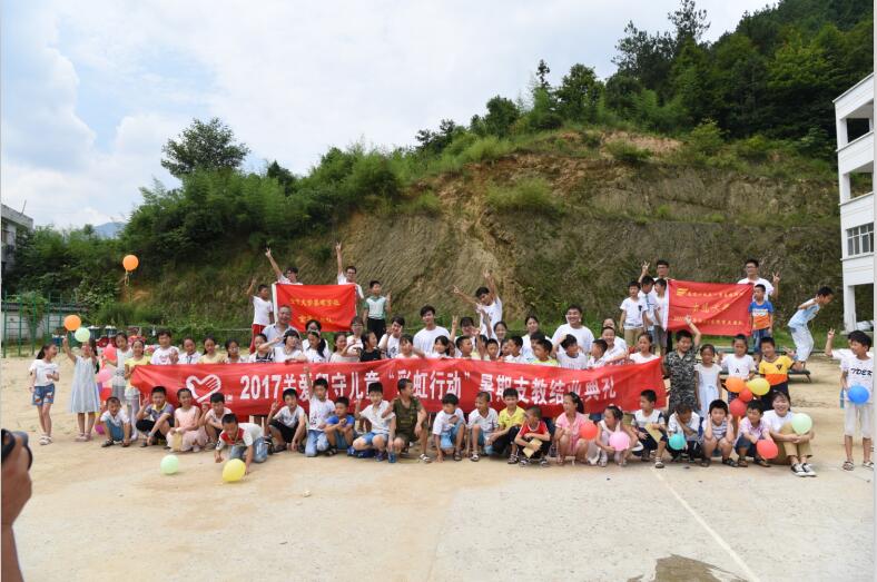 “关爱从心,扶贫在智”,8月7日,由安徽省志愿者协会公益工作委员会发起的2017关爱留守儿童“彩虹行动”暑期支教结课典礼暨文艺汇演在金寨县天堂寨中心小学举办。此次彩虹行动大学生支教志愿服务时长达3240小时,计受益人数约2770人次。