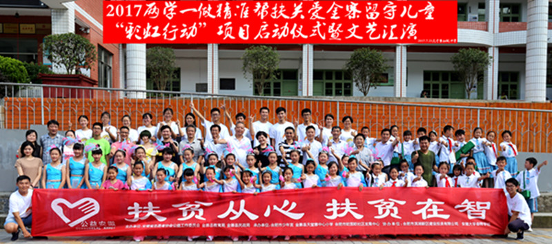 7月21日,以“关爱从心,扶贫在智”为主题的2017两学一做精准帮扶关爱金寨留守儿童“彩虹行动”的项目启动仪式暨文艺汇演在金寨县天堂寨初级中学举行。此次活动由安徽省志愿者协会公益工作委员会、金寨县教育局、金寨县民政局主办,旨在改善金寨地区留守儿童生安徽省社会组织党建指导员段贤来应邀出席仪式、安徽省志公委、金寨县民政局、金寨县教育局,合肥市少年宫、天堂寨中心小学等单位相关领导也应邀出席仪式,天堂寨中心小学留守儿童、老师和合肥市少年宫孩子200余人参加了仪式。