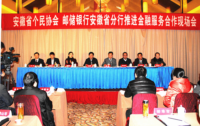 根据全省经济工作会议“积极扩大有效需求,着力保持经济持续健康较快发展”部署要求,2013年1月9日,安徽省个体民营企业协会和中国邮政储蓄银行安徽省分行在淮北市共同召开推进金融服务合作现场会。会议总结交流近年两个系统在合作开展金融服务方面的工作情况,推广淮北市等地银协、银企合作的成功经验,签署了进一步合作开展金融服务意向书,研究部署扩大合作为个私企业开展金融服务的有效途径。全省各地个民协会会长、秘书长,各市邮储银行分管领导、信贷部经理参加了会议。淮北市政府副市长周勇到会并致辞,中国邮政储蓄银行安徽省分行副行长周蕙民、省工商局副局长、省个体民营企业协会会长沈基明出席会议并讲话。省个体民营企业协会秘书长王登山主持了会议。