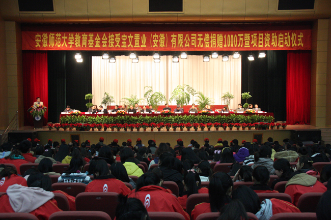 11月18日上午,安徽师范大学教育基金会接受宝文置业(安徽)有限公司无偿捐赠1000万暨项目资助启动仪式在花津校区大礼堂举行。宝文置业(安徽)有限公司董事长王大明,省及学校老领导吴昌期、陆子修、季昆森、杨新生、沈家仕、丁万鼎,合肥市人大常委会主任黄同文、省教育厅副厅长杨德林、省财政厅副厅长吴天宏、省民政厅民间组织管理局副局长张亚平、安徽教育报原总编黄元访,校领导顾家山、王伦、王绍武、李琳琦、校长助理沈洪以及各学院各单位负责人等出席会议,文学院1000多名学子参与捐赠仪式。启动仪式由校党委书记顾家山主持。