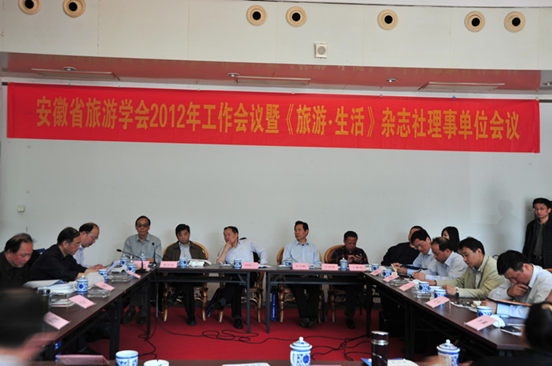 2012年4月27日下午,安徽省旅游学会假座合肥市赖少其艺术馆召开工作会议。会长钟咏三、常务副会长兼秘书长金寿虎、常务副会长杨力国、章尚正,副会长张宗良、孔令航、丁继明、王世清,常务副秘书长、《旅游·生活》杂志主编项贤峻,副秘书长尤传楷,《旅游·生活》杂志常务副主编王晓萍等出席会议,省社科联、省民管局、省旅游局、省新闻出版局、省出版集团的领导,华泰集团、泓瑞金陵大酒店、古井集团、安徽环宇国际旅行社、安徽康辉国际旅行社等多家理事单位及新闻媒体代表应邀参加会议,会议由副会长杨力国主持。