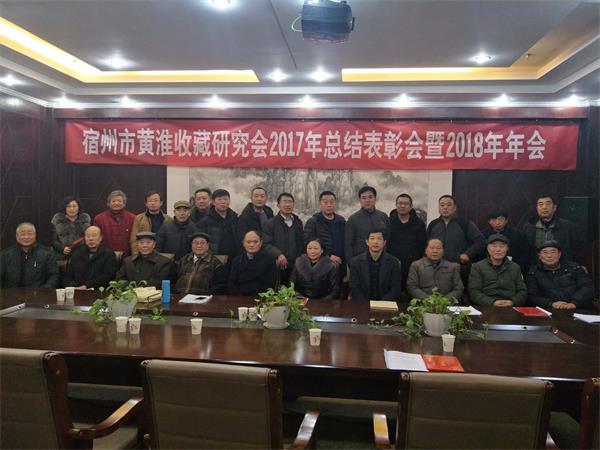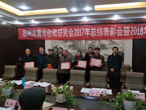 2018年1月20日,宿州市黄淮收藏研究会2017年总结表彰会暨2018年年会在宿州市博物馆二楼会议室召开。宿州市黄淮收研究会会长张满胜做工作报告,副会长邢培林主持会议,《黄淮文博》主编于吉瑞发表新年致辞,秘书长金友超宣布表彰决定。张满胜会长在2017年工作报告中从5个方面阐述了研究会2017年的主要工作成绩与存在的不足,从13个方面安排部署2018年的主要工作。