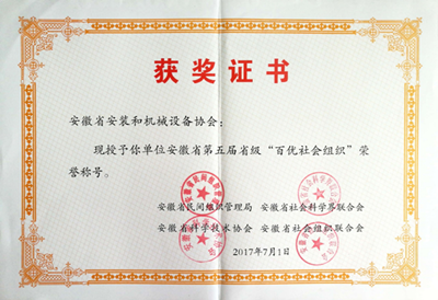 2017年7月,安徽省安装和机械设备协会第三次荣获安徽省第五届省级“百优社会组织”称号,并由安徽省民间组织管理局、安徽省社会科学界联合会、安徽省科学技术协会、安徽省社会组织联合会联合颁发了荣誉证书。