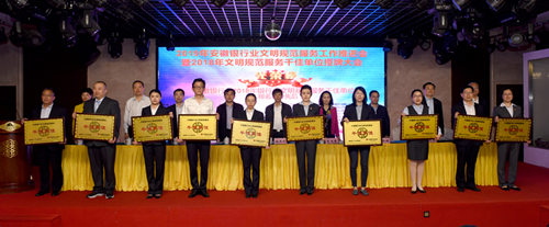 2018年,安徽省银行业协会通过精心组织,推动“千佳单位”达标评估工作顺利开展;通过2017年百佳单位和部分五星级营业网点的现场授牌,扩大获奖营业网点的服务品牌影响力;通过开展网点复查工作,巩固我省文明规范服务的创建成果;通过系统专业培训,提升全省银行业文明规范服务内涵;通过开展“走出去”活动,拓宽会员单位文明规范服务创建新视野。