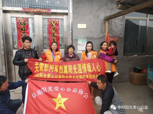 阜阳阳光爱心公益协会会长谢尚斌介绍,这次活动得到了安徽通圆建筑工程有限公司的大力支持,细心的爱心人士田文莉给老人买来了4床新被子,还有很多像李楠、孙飞飞、王伟东这样的爱心人士出钱出资看望军烈属,还有很多志愿者看到行动不便的军烈属,积极主动要求每周上门做志愿服务。