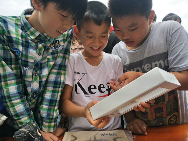 9月20日上午,霍山县大化坪中心小学的同学们惊喜地讨论远古狼鳍鱼化石。