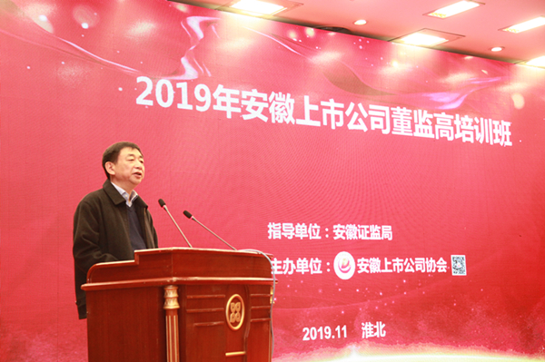 11月21-22日,由我会主办的2019年安徽上市公司董监高培训班在淮北召开,来自辖区上市公司的董事长、总经理、公司实控人与控股股东、董事、监事及公司高管等260余人参加培训。安徽证监局党委书记、局长叶锦伟出席并做主题报告。本次培训班特邀中国证监会、安徽证监局、深交所以及市场机构的专家授课。
