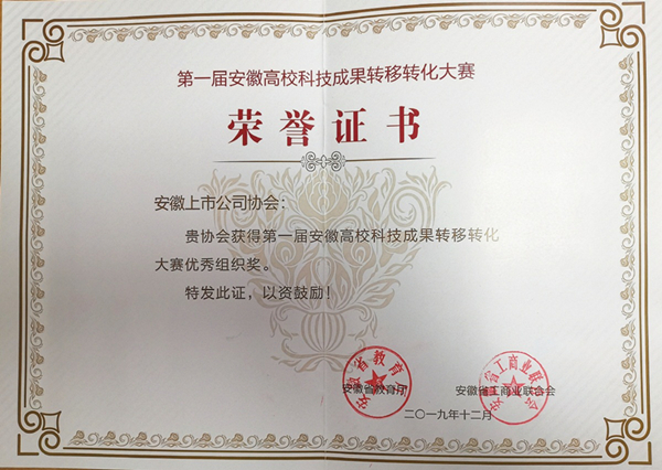 安徽上市公司协会于12月27日参加在合肥召开的全省促进高校科技成果转移转化服务民企创新发展交流会。副省长、省工商联主席王翠凤出席会议并颁奖。安徽上市公司协会荣获“第一届安徽高校科技成果转移转化大赛优秀组织奖”荣誉称号。