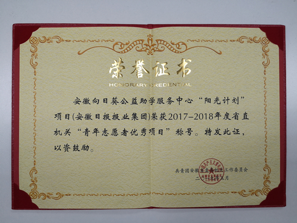 ○ 2019年5月,向日葵“阳光计划”项目被评为安徽省直机关“青年志愿者优秀项目”。