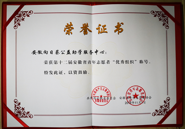 ○ 2019年11月,向日葵被评为第十二届安徽省青年志愿者“优秀组织”。