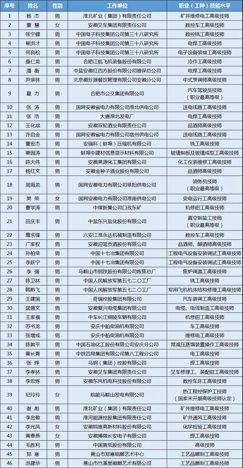 根据《安徽省高技能人才评选表彰办法》等规定,经各市及有关部门遴选推荐,省高技能人才评审委员会评审,省委组织部、省人力资源社会保障厅决定授予杨杰等46名同志“江淮杰出工匠”称号,颁发荣誉证书和奖金;授予王业飞等100名同志“安徽省技能大奖”称号,颁发荣誉证书和奖金。