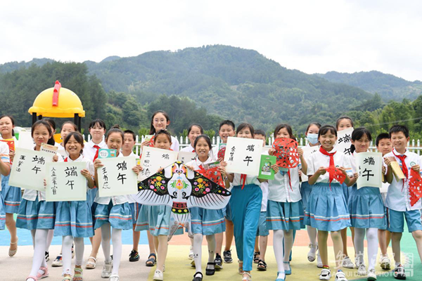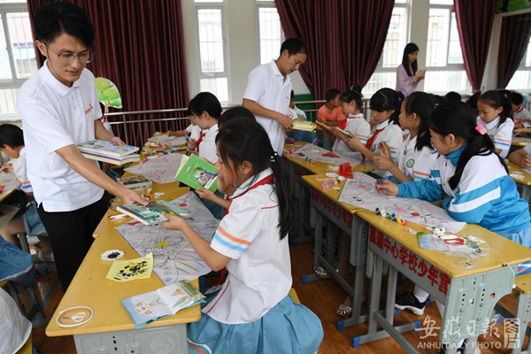 6月19日,安徽向日葵公益助学服务中心联合合肥经开区社会发展局团委青年志愿者,走进岳西县菖蒲镇辅导小学,开启“传承传统文化 端午爱心助学”文化之旅,与山区孩子面对面交流书法、剪纸艺术,并共同绘制纸鸢欢度端午。同时,主办方还为该校捐赠了笔墨纸砚和书法作品,并走访了部分特困学子,为他们每人送去一份节日礼物和1000元爱心红包。(安徽日报 记者 徐?F昊 摄)