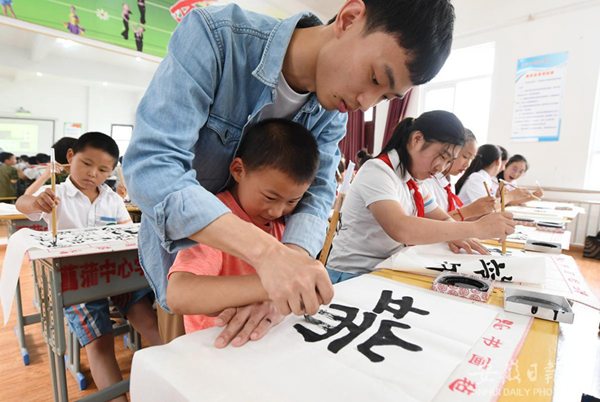 志愿者教孩子们用毛笔写“端午”