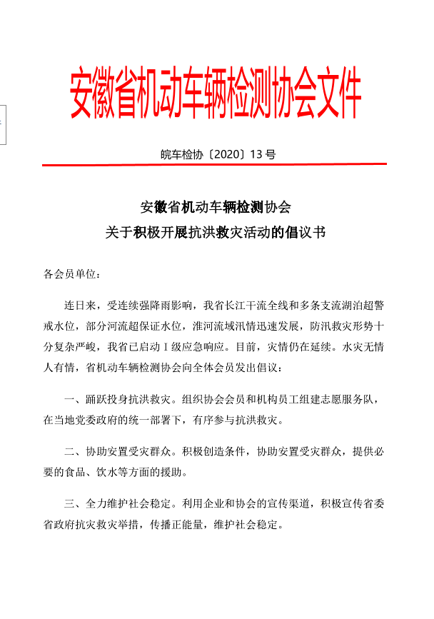 安徽省机动车辆检测协会关于积极开展抗洪救灾活动的倡议书