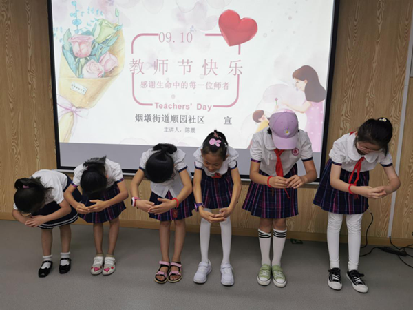 此次活动,通过手工制作教师节贺卡、花束及行“拜师礼”,孩子们付诸实际行动来表达对老师的感恩之情,发扬了尊师重道的优良传统。同时将感恩的种子播种在孩子们的心中,并将不断延续伴随他们成长。(顺园社区:陈晨 李湘徽)