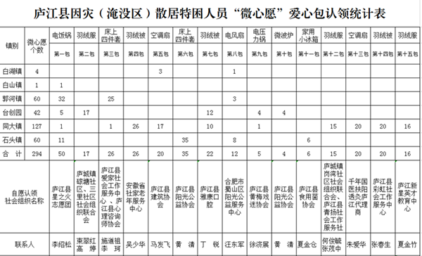 共收集受灾严重6个镇(台创园)散居特困供养对象的“微心愿”共294个,其中:家用电器类“微心愿”114个、生活衣被类“微心愿”176个、其他方面“微心愿”4个。