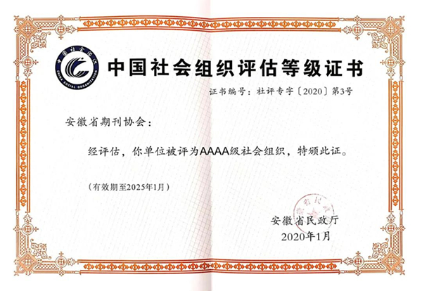 2019年,省期刊协会被省民政厅评为“4A级社会组织”。2020年11月12日省社会组织管理局副局长张同金、业务主任唐麟,省社会组织联合会秘书长汪祥中到省期刊协会颁发4A级社会组织证书并授牌,省期刊协会副主席黄河胜、秘书长孟黎东参加授牌仪式。
