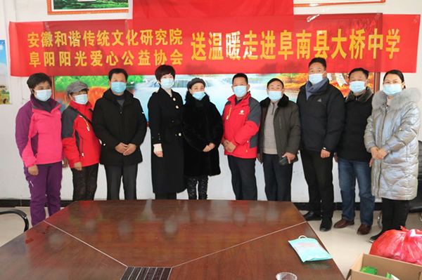 12月23日上午,安徽和谐传统文化研究院携手阜阳阳光爱心公益协会和安徽沃德堡整体家居定制有限公司一同走进阜南县许堂乡大桥中学,为该校“失依”孩子送来羽绒袄、棉鞋、耳暖等御寒物品和学习用品。