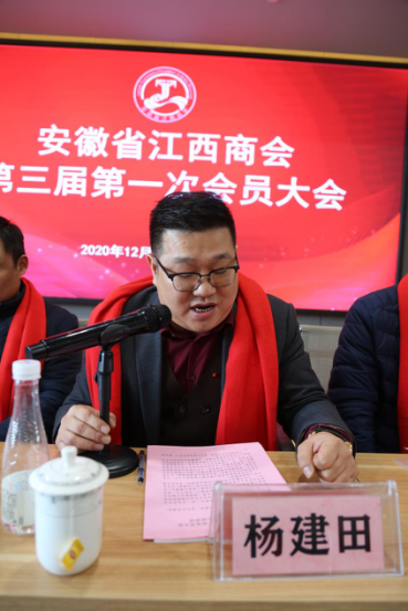 新当选会长杨建田发言。杨会长对大家选举他为新一届会长表示真诚感谢,对一届、二届理事会为商会发展付出表示诚挚感谢!杨会长从“商会”在商言商,搭建平台促发展;“商会”多开会,红红火火办好商会;商会是个大家庭,在皖赣商一家亲等几个方面对今后的商会工作进行了阐述。杨会长指出,商会要继续学习贯彻十九大精神及习总书记系列讲话精神,始终以“凝聚乡情、团结互助、资源共享、共谋发展”为宗旨,不忘初心,担当使命,发挥好政府与企业的桥梁纽带作用,做好服务,加强乡情联谊,加强赣商团结协作,共同整合赣商力量,擦亮“赣商”金子招牌,提升赣商影响力。杨会长表示,他更希望在他的任届四年中,带领商会核心团队打造出一个听党话、跟党走,积极向上、团结友爱、活力四射且有一定影响力的优秀商会。他还表示积极为商会奉献,将无偿提供一层办公楼给商会办公。