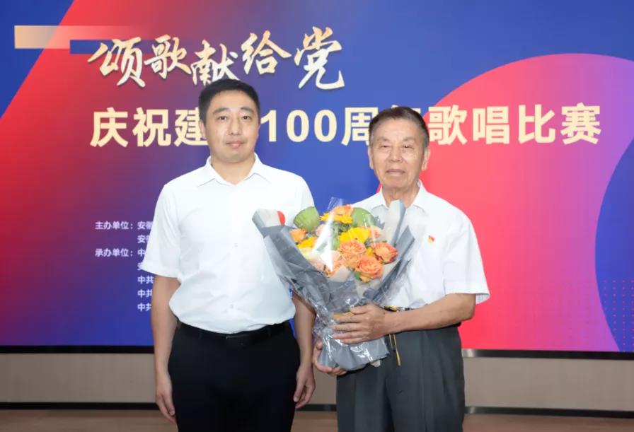 安徽省社会组织联合会秘书长汪祥中代表全体人员,在比赛过程中向张海银理事长献花,并祝贺他荣获“光荣在党50年”荣誉纪念章。