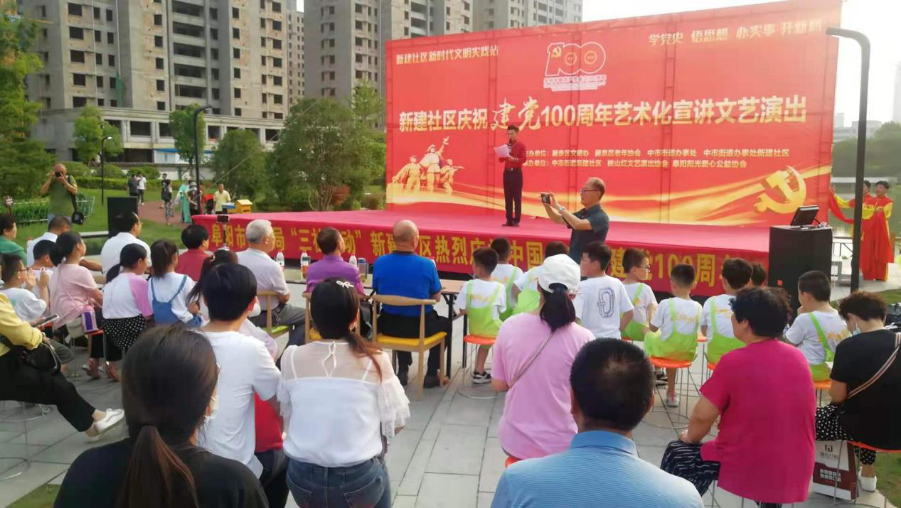 为庆祝建党百年华诞,阜阳市“三社联动”试点项目,在阜阳市民政局指导下,阜阳阳光爱心公益协会联合新建社区,颍泉区文明办颍泉区老年协会、中市街道办事处新建社区,6月27日晚上,在慧湖广场举行了建党100周年艺术文化宣讲演出。