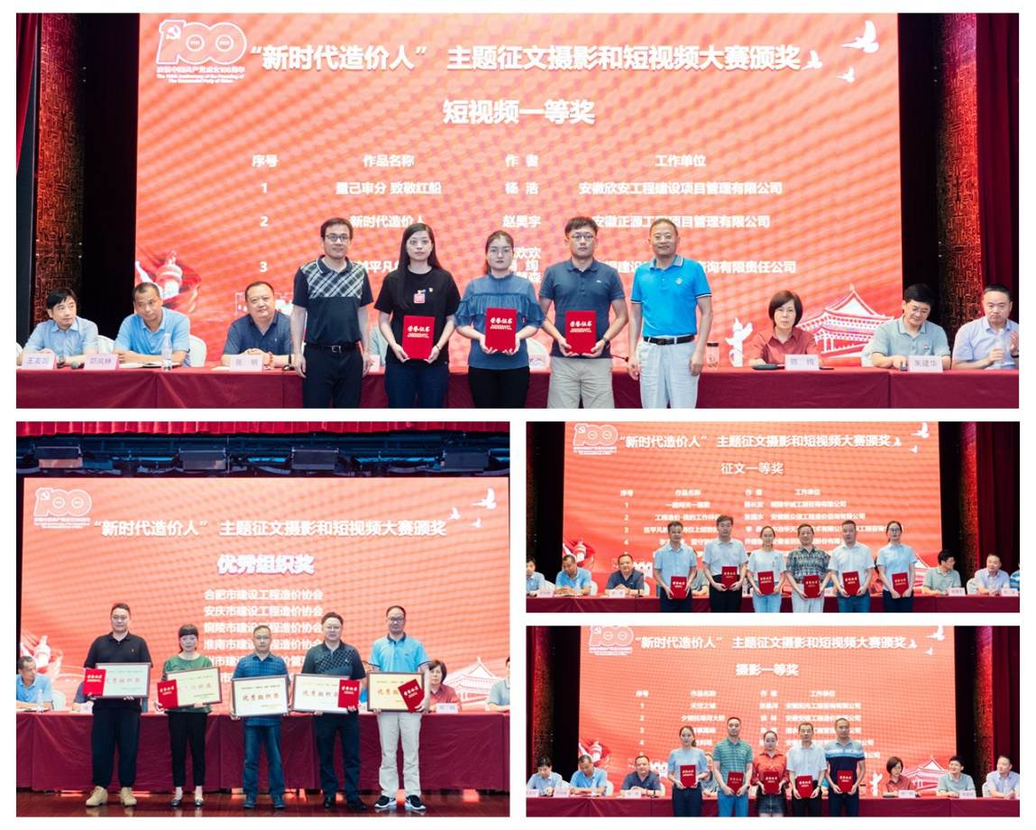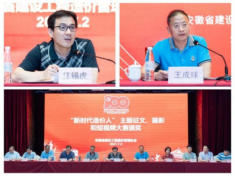 会议还举行了庆祝建党100周年“新时代造价人”征文、摄影和短视频大赛获奖作品颁奖仪式。江锡虎站长、王成球理事长及协会各位副理事长为获奖选手和单位颁发了证书、奖牌。大赛共评出征文类获奖作品65篇,摄影类获奖作品67幅,短视频类获奖作品34部,6个市级协会获优秀组织奖。