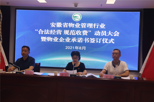 8月6日下午,安徽省物业管理行业“合法经营 规范收费”动员大会暨物业企业承诺书签订仪式在合肥举行。受省住房和城乡建设厅房地产市场监管处处长王立国委托,副处长海波出席会议,安徽省物业管理协会会长凌宁主持会议。